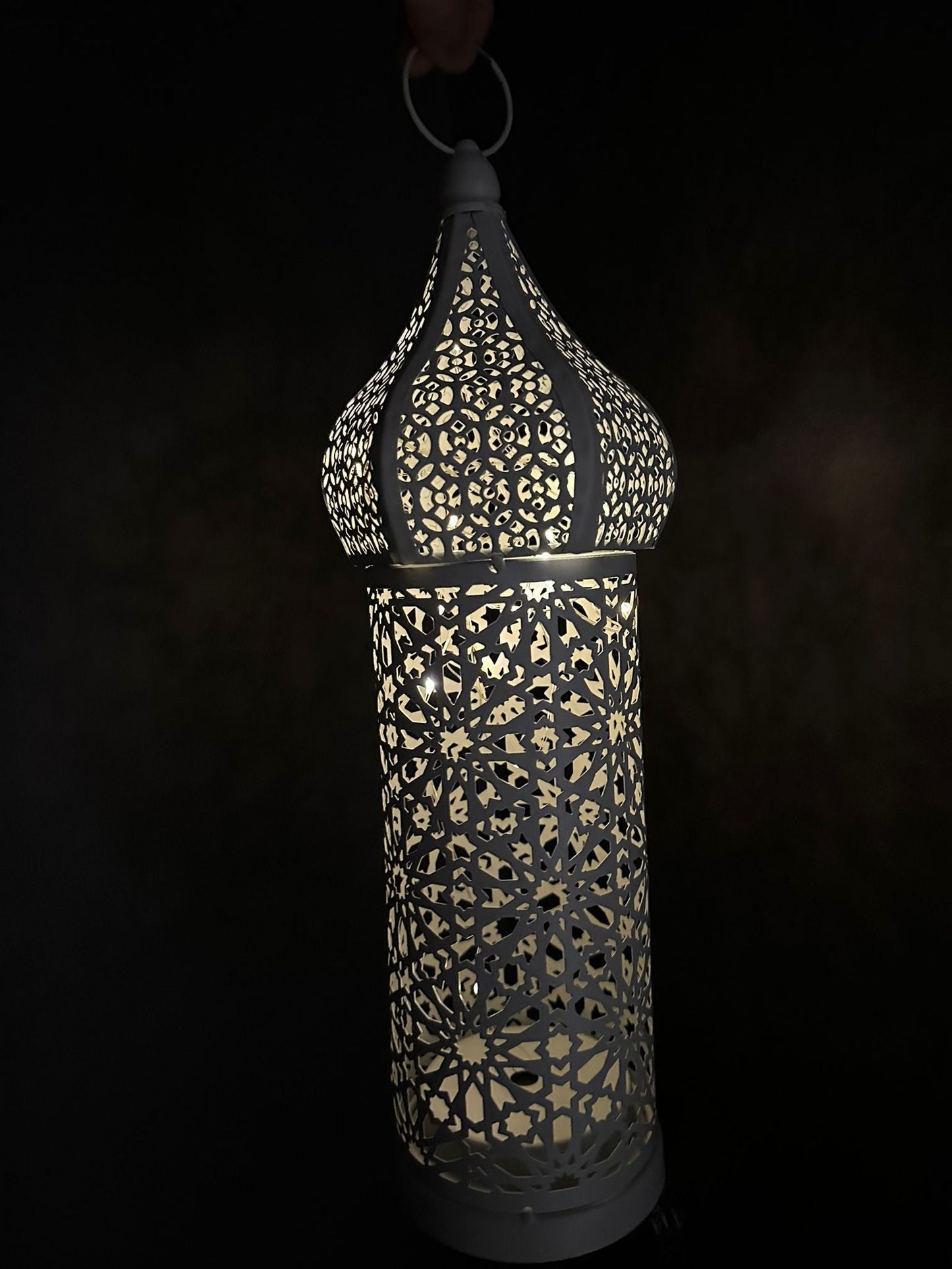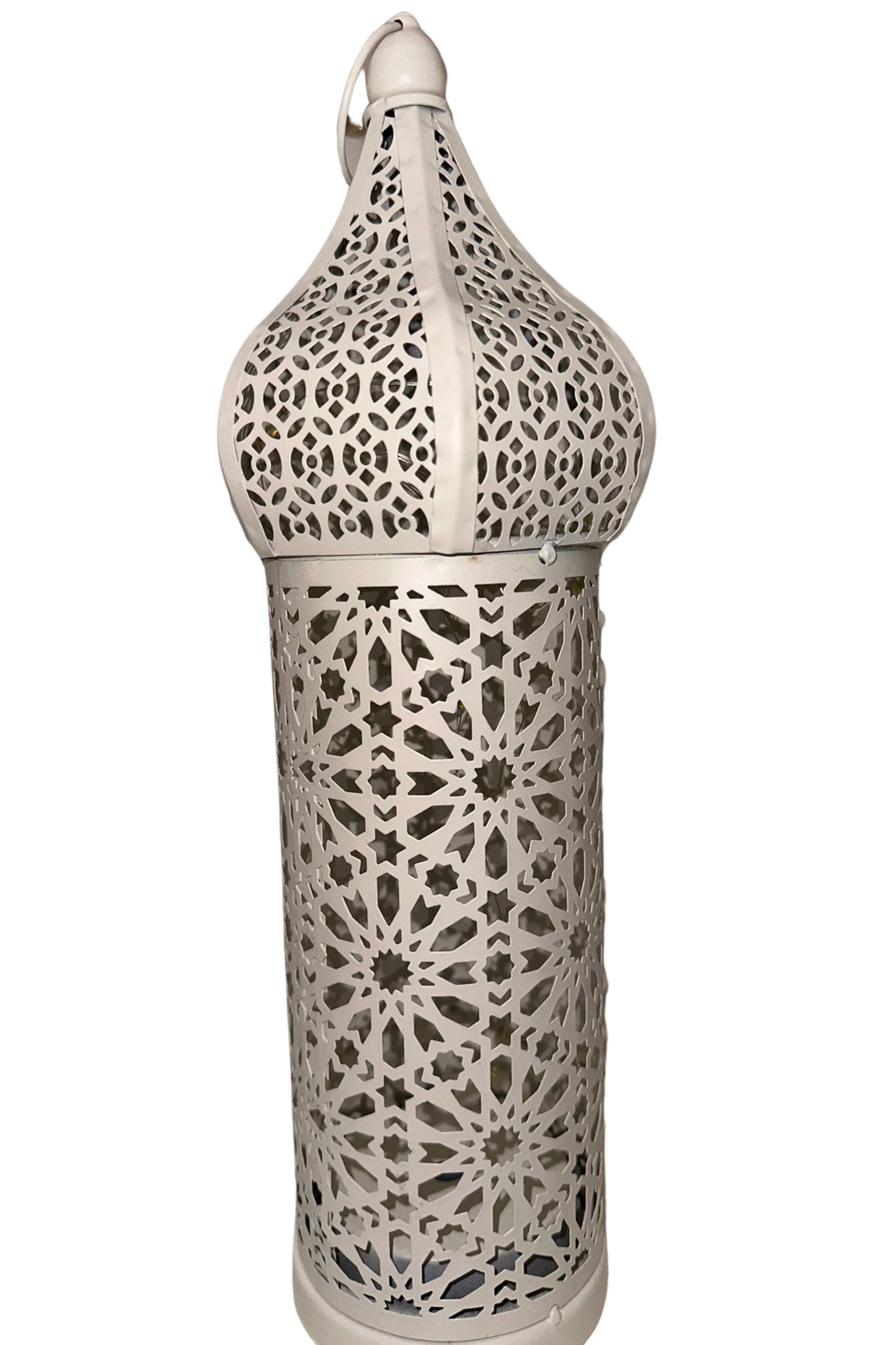 This gorgeous white Moroccan-inspired lantern stands 14.5 inches tall and includes a metal ring to easily hang. This lantern lights up with the use of three AAA (triple A) batteries. Batteries are sold separately. An easy on-off switch is located at the base of the lantern. Our lantern has a iron outer structure with fairy lights conveniently located inside.